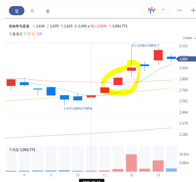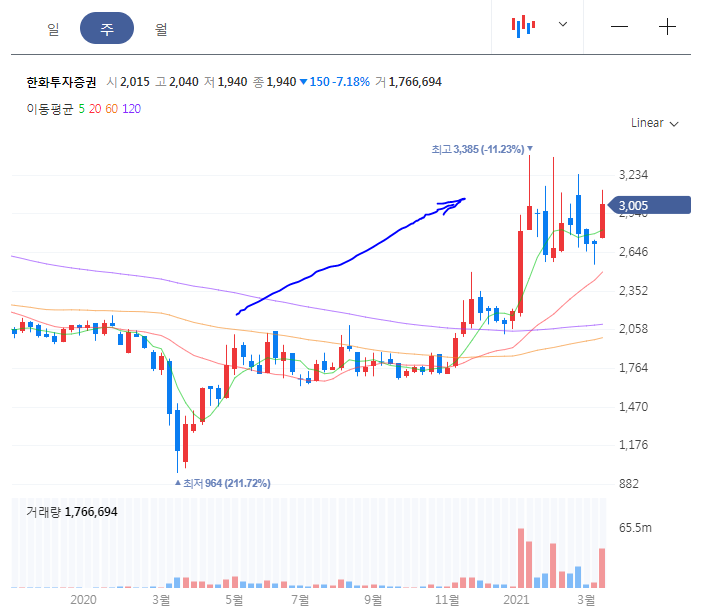 한화투자증권, 증권사들 중에서는 중소형 증권사로 시총 6630억원, 주당 가격은 액면가 5천원에도 못 미치는 3090원, 이런 소외에 소외되어 있던 주식이 흐름이 좋다. 근데 가상화폐가 왠말이냐고?
